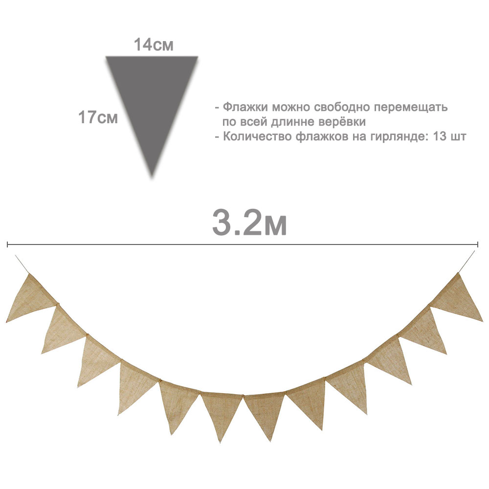 Длина -  3,2 метра, флажки можно свободно перемещать во всей длинне верёвки.
