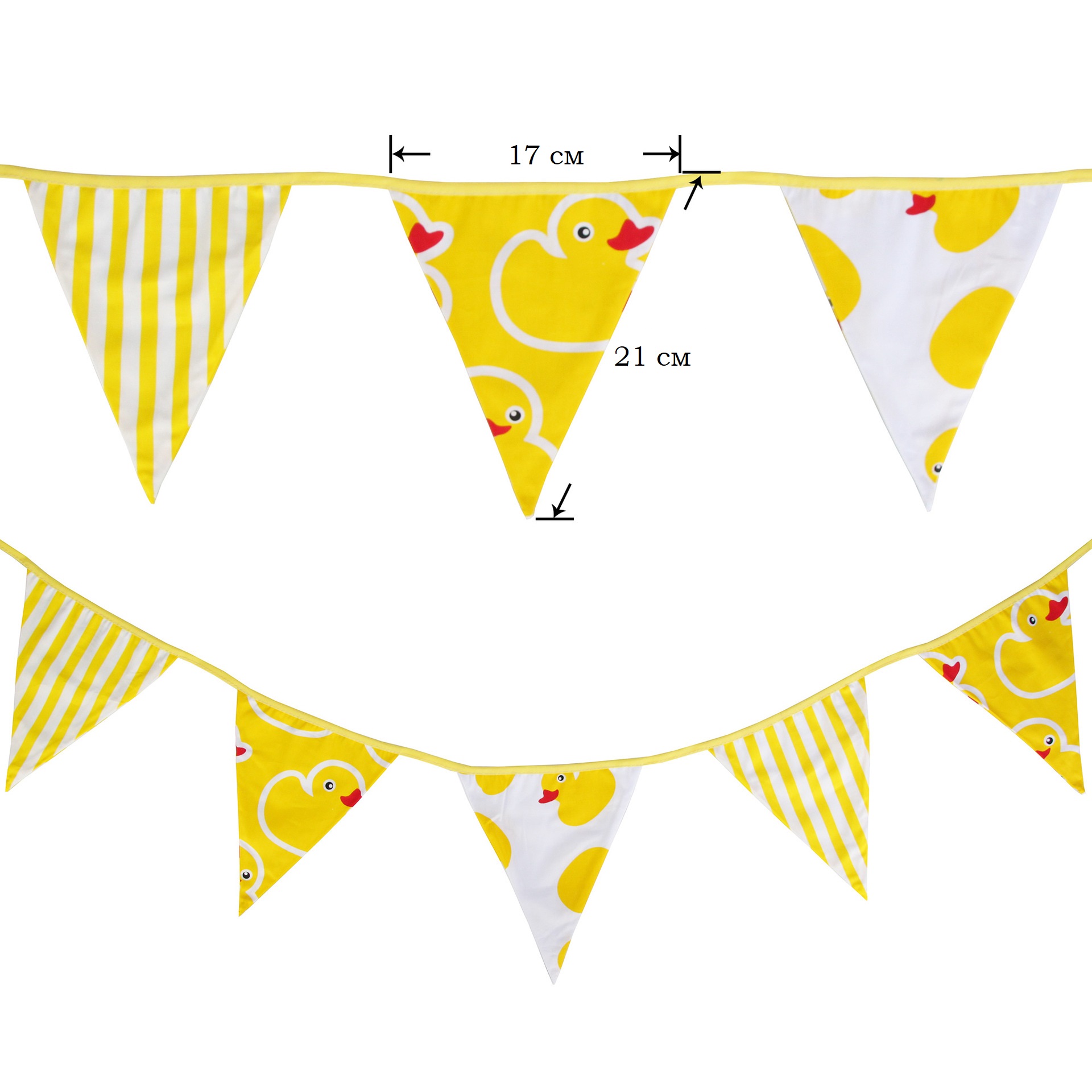 Гирлянда состоит из 12 флажков, расстояние между флажками 6 см, общая длина составляет 4 м.
