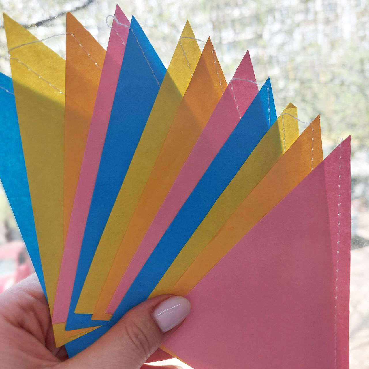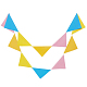 Декоративная гирлянда в форме вымпела, декорированная красочными бумажными двусторонними треугольниками.