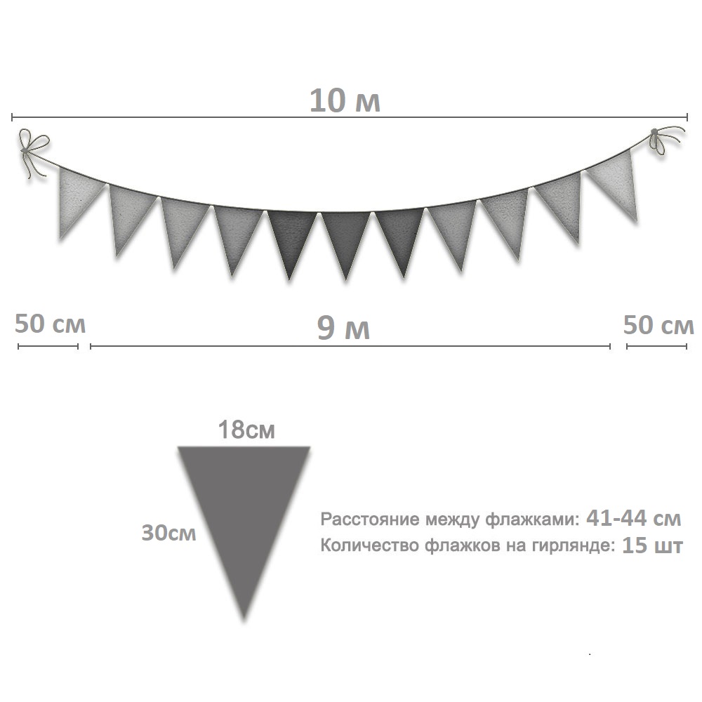 Флажковые гирлянды для уличного и интерьерного декора. Размер одного флажка — 18×30 см. Длина каждой гирлянды составляет 10 метров: флажки размещены на участке длиной 9 м, по 50 см верёвки с каждой стороны для удобного крепления.