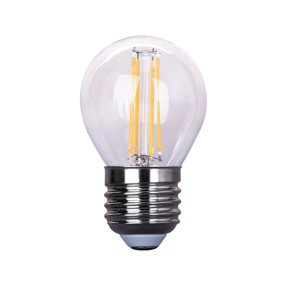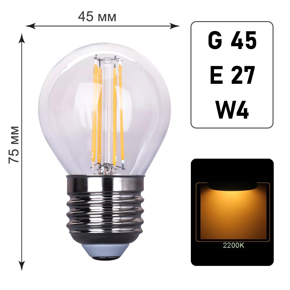 Лампа светодиодная стандарта G45 E27 с мощностью 4 Вт. По силе света заменяет классические источники света 40Вт. Отличный выбор для установки в ретро-гирлянды и другие декоративные приборы. Свет теплый в диапазоне 2200К. Заявленный срок службы 25000 ч.