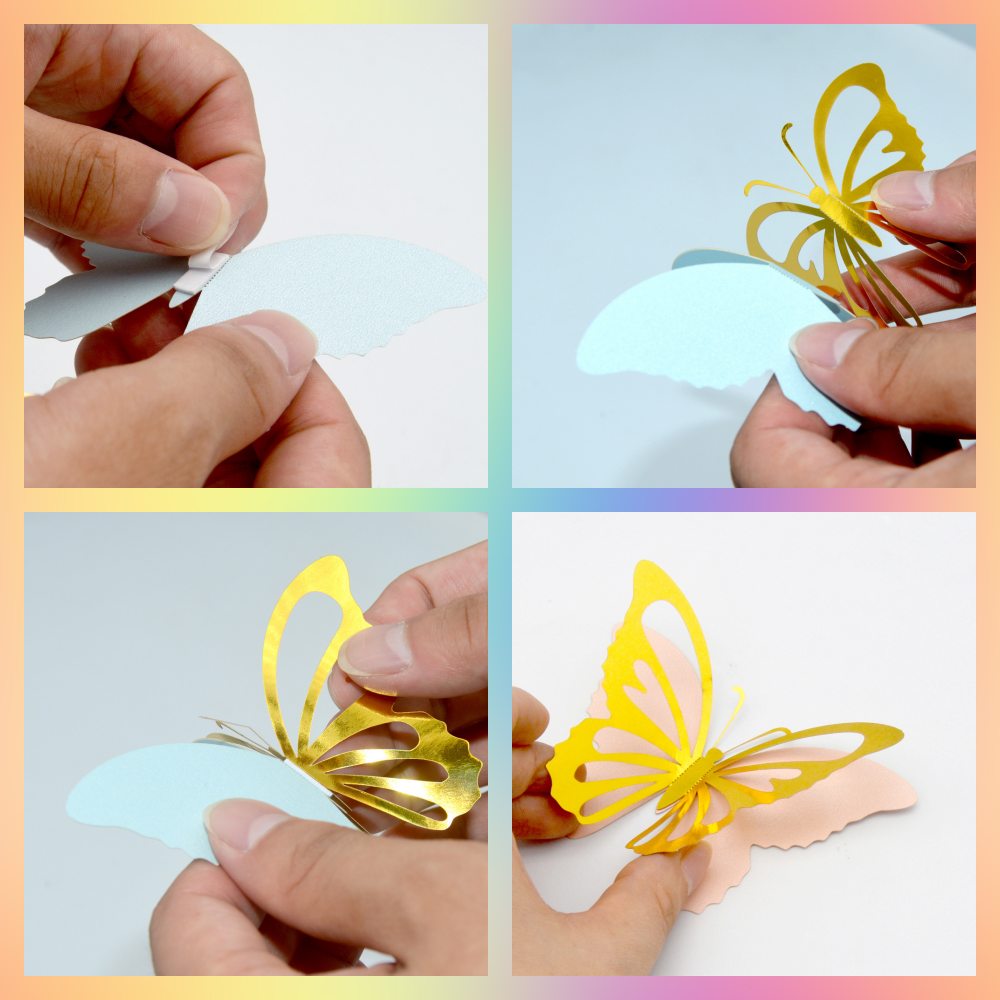 Бабочка состоят из двух частей цветная бабочка + золотая бабочка с перфорацией. Соединяются между собой клейкими кругами, которые идут в комплекте.