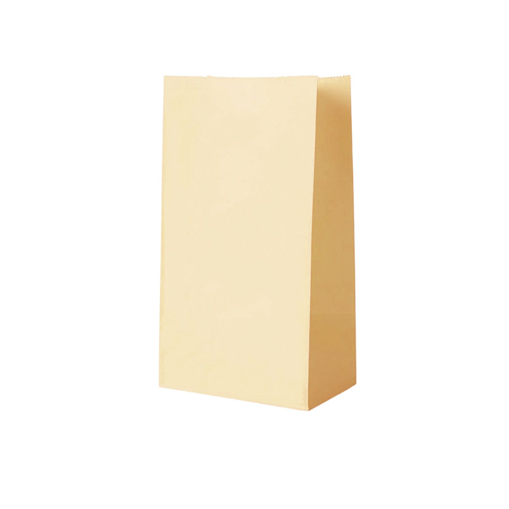 Подарочный пакет из крафтовой бумаги пастельного оттенка с белыми бумажными ручками и белой внутренней стороной.