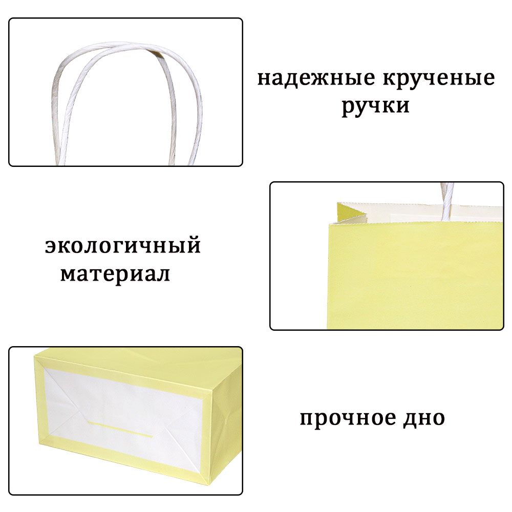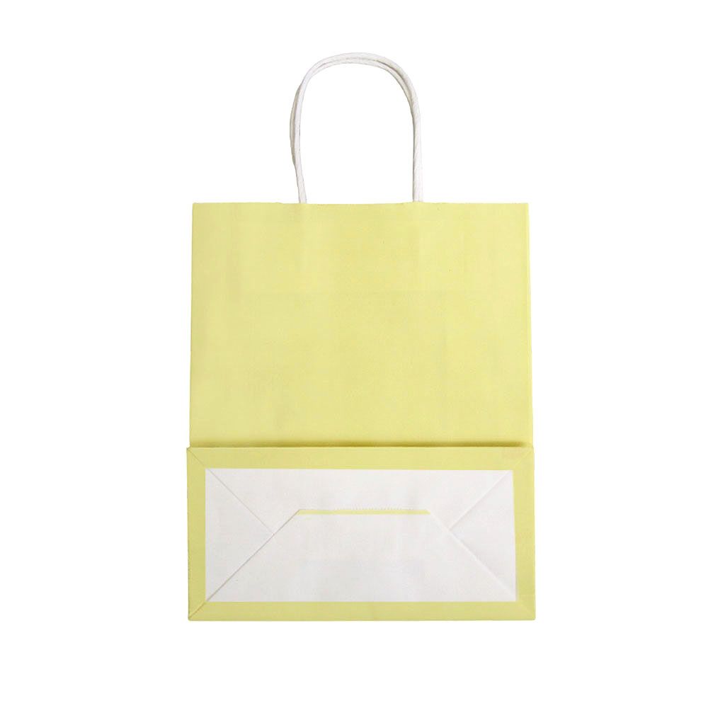 Подарочный пакет из крафтовой бумаги пастельного оттенка с белыми бумажными ручками и белой внутренней стороной.