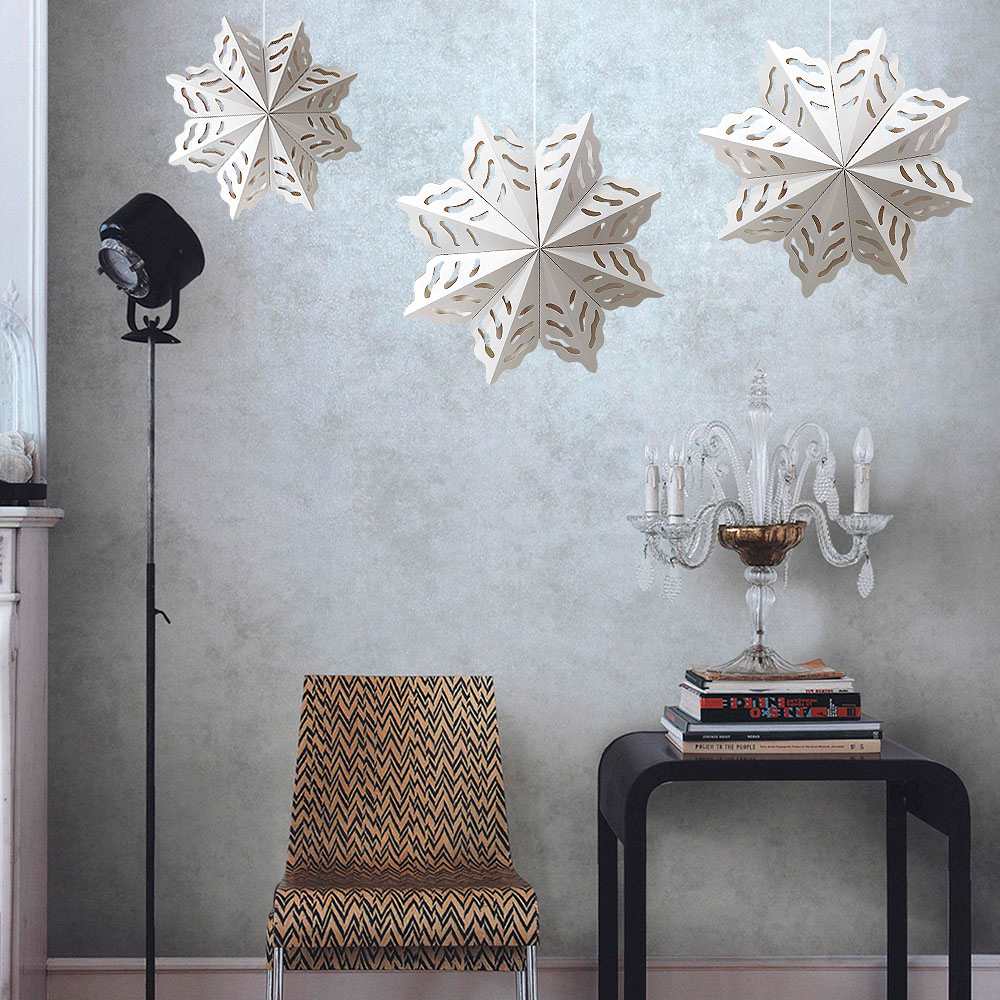 Элегантная объёмная снежинка из плотной бумаги белого цвета — изысканное украшение для зимнего интерьера, витрин, залов и новогодних фотозон. Ажурный рисунок придаёт ей лёгкость и воздушность, создавая ощущение снежной свежести и уюта.
