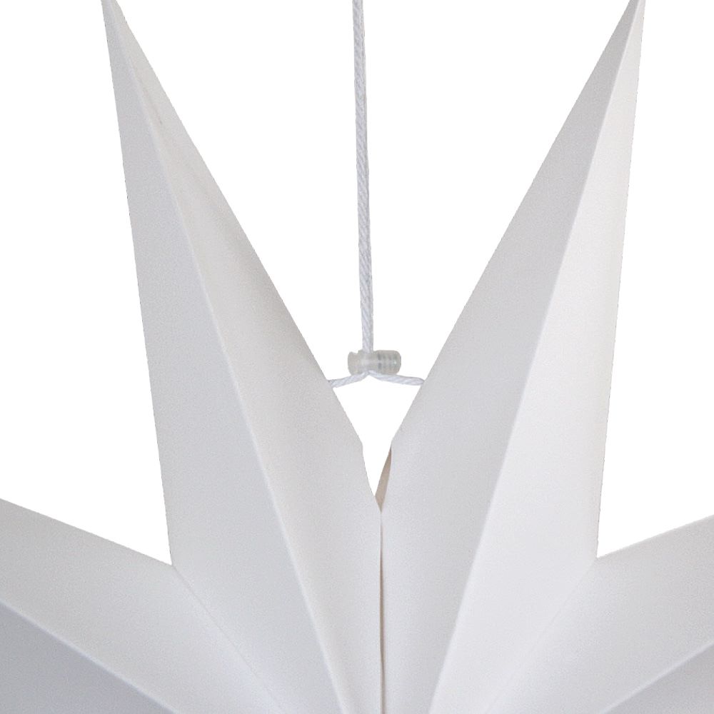 Объёмная декоративная звезда из картона диаметром 30 см с 9 лучами. Оснащена встроенным шнурком для подвешивания. Поставляется в компактном сложенном виде и быстро собирается: специальный шнурок при затягивании придаёт изделию объём и фиксирует форму. После сборки звезда остаётся устойчивой без дополнительных креплений и может использоваться многократно.