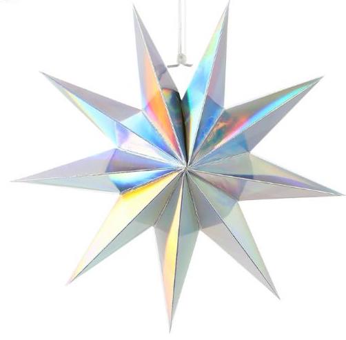 Объёмная девятиконечная звезда 45 см — декоративный элемент для интерьера и праздничного оформления. Лёгкая интерьерная звезда из картона хорошо держит форму и создаёт выразительный объём. Поставляется в сложенном виде, в комплекте шнур для фиксации объёма и подвеса.